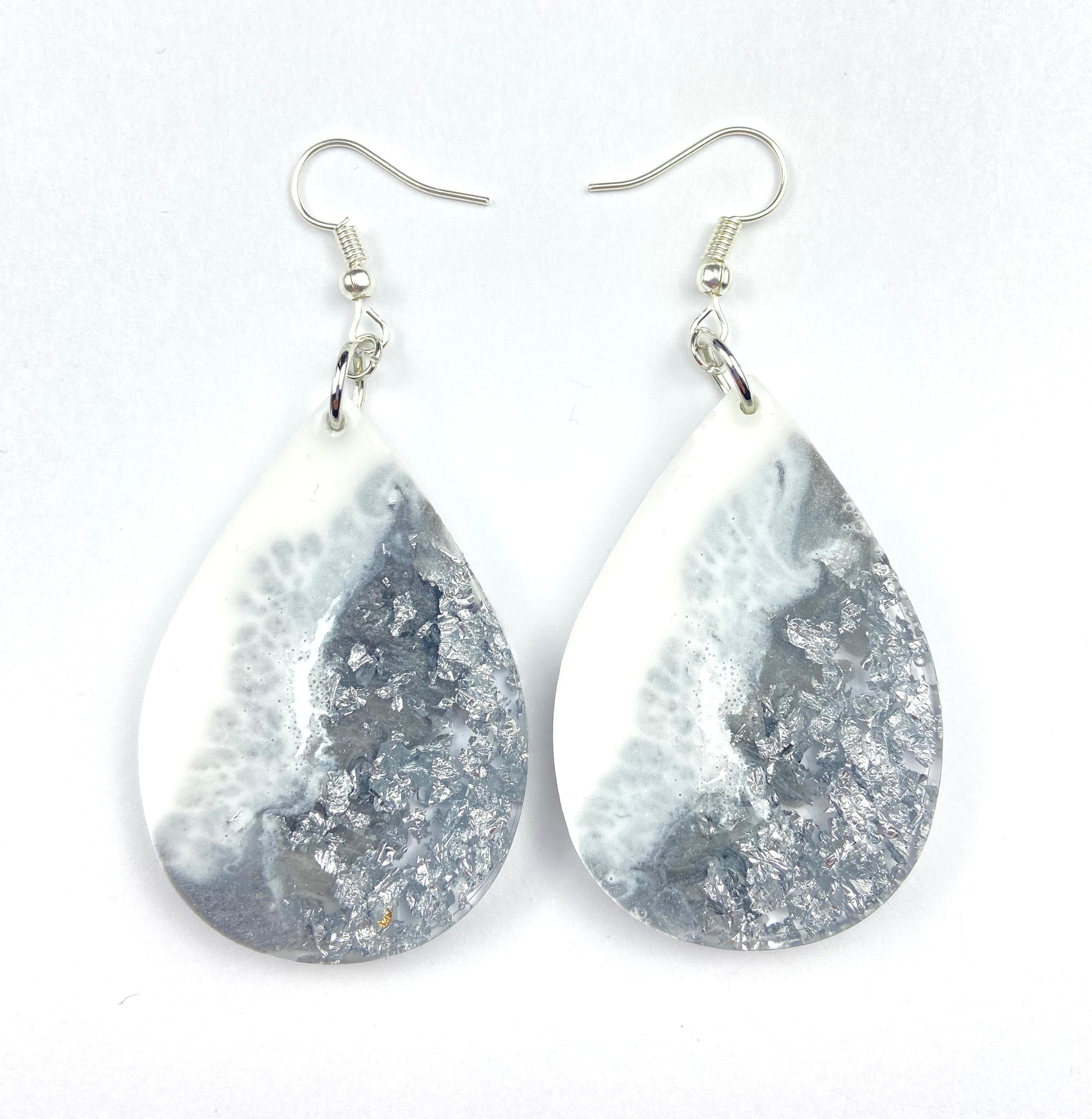 These are in the “Silver Lining Collection” made with resin they are light and airy. You will barley feel you are wearing them. The perfect combination of white silver and silver foil.